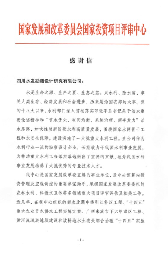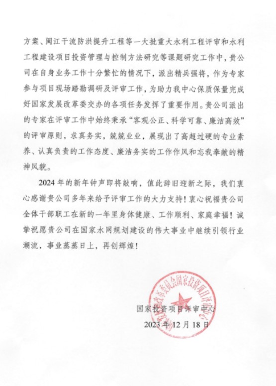 近日,國家發(fā)展改革委國家投資項目評審中心向公司發(fā)來了感謝信,對公司作為水利行業(yè)一流的勘察設計企業(yè),長期致力于我國水利事業(yè)發(fā)展做出的重要貢獻給予高度評價。對公司支持國家投資項目評審中心工作表示感謝,并祝愿公司事業(yè)蒸蒸日上,繼續(xù)引領行業(yè)潮流。