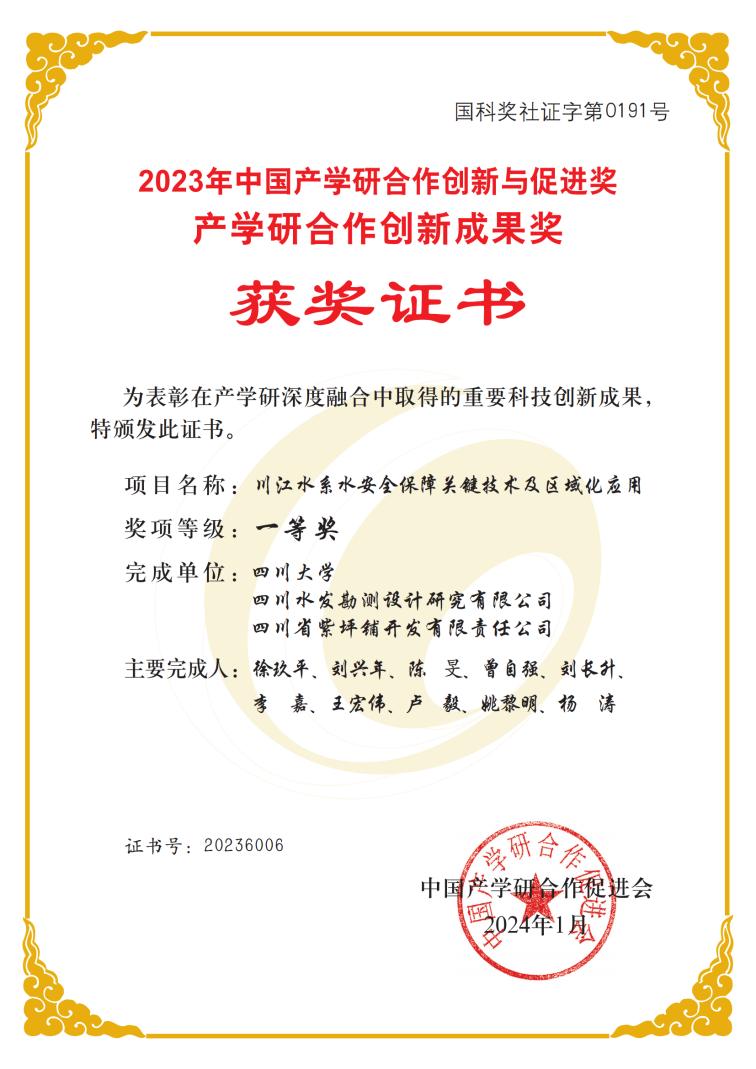 近日,由中國產(chǎn)學(xué)研合作促進(jìn)會(huì)主辦的第十五屆中國產(chǎn)學(xué)研合作創(chuàng)新大會(huì)在北京隆重舉行,會(huì)議對(duì)2023年在產(chǎn)學(xué)研深度融合等方面作出貢獻(xiàn)的先進(jìn)單位和個(gè)人進(jìn)行了頒獎(jiǎng)表彰,由我公司聯(lián)合四川大學(xué)、四川省紫坪鋪開發(fā)有限責(zé)任公司完成的項(xiàng)目“川江水系水安全保障關(guān)鍵技術(shù)及區(qū)域化應(yīng)用”榮獲2023年產(chǎn)學(xué)研合作創(chuàng)新成果一等獎(jiǎng)。這是公司首次斬獲該榮譽(yù),是公司大力發(fā)展科技創(chuàng)新的重要成果,彰顯了公司在水安全保障領(lǐng)域開展高質(zhì)量產(chǎn)學(xué)研創(chuàng)新協(xié)同的創(chuàng)新成果。
