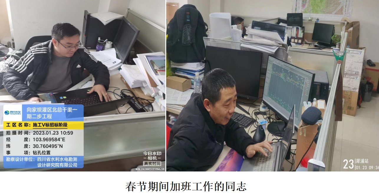 大年初二—2023年新春佳節(jié)的第二天,勘察分院的曾威、鄔建華等同志一大早就回到辦公室開始一天緊張的工作。自2023年1月11日向家壩灌區(qū)北總干渠一期二步工程招標(biāo)工作推進(jìn)會后,設(shè)計專業(yè)對施工Ⅴ標(biāo)的隆昌供水管線(長約43km)和江瀘干渠后段(長約27km)局部渠線的設(shè)計方案作了數(shù)次變更調(diào)整優(yōu)化,為了保證1月30日前完成招標(biāo)技術(shù)條款、招標(biāo)設(shè)計圖冊及2月3日提交正式招標(biāo)成果的節(jié)點目標(biāo),勘察分院立即組織人員設(shè)備,開展相關(guān)外業(yè)地質(zhì)測繪及勘探工作。在面臨時間緊、任務(wù)艱巨的時刻,勘察分院精心組織,吹響 “集結(jié)號”,盡一切可能抽調(diào)更多的專業(yè)技術(shù)人員參與向家壩灌區(qū)北總干渠一期二步工程施工Ⅴ標(biāo)的招標(biāo)設(shè)計工作,加班加點完成渠線及各建筑物的工程地質(zhì)縱橫剖面。受設(shè)計方案優(yōu)化調(diào)整影響,各建筑物樁號需作相應(yīng)調(diào)整,相關(guān)圖紙及報告亦需作修改,從而影響了該項目的計劃進(jìn)度。為了確保公司既定的節(jié)點目標(biāo)及施工Ⅴ標(biāo)的招標(biāo)工作如期順利進(jìn)行,曾威、鄔建華、魏利剛等三位同志犧牲陪伴家人朋友春節(jié)歡聚一堂的時光,默默堅守在自已的工作崗位用自己的實際行動詮釋了責(zé)任與擔(dān)當(dāng)。