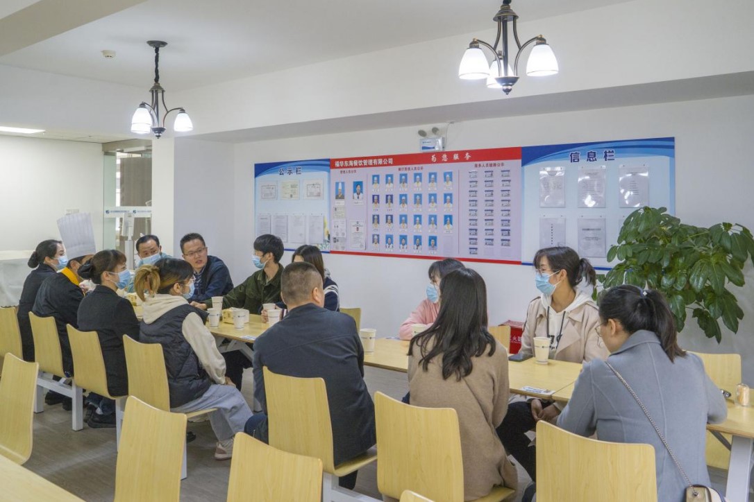 實地查看結(jié)束后,職工代表與食堂工作人員對食品進(jìn)貨、材料儲存、食品加工及環(huán)境衛(wèi)生等進(jìn)行座談交流。