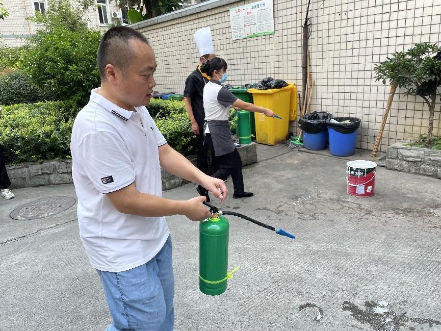 后勤服務(wù)部工作人員對(duì)于如何正確操作滅火器、如何處置突發(fā)火災(zāi)事件進(jìn)行了生動(dòng)講述,隨后帶領(lǐng)大家實(shí)際操作了水基滅火器。并要求食堂人員必須熟練掌握使用滅火器。