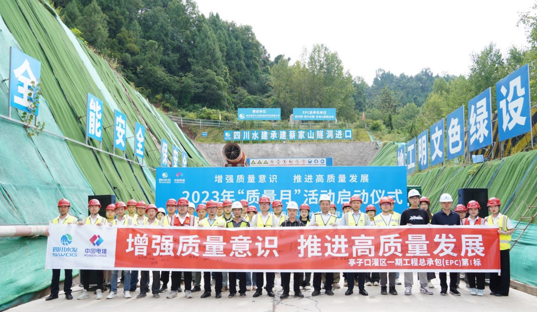 9月初,亭子口灌區(qū)一期工程設(shè)計-采購-施工總承包(EPC)第Ⅰ標項目部組織EPC項目部全體職工及現(xiàn)場主要參建單位代表在蔡家山隧洞進口舉行“質(zhì)量月”活動啟動儀式,在啟動儀式上傳達了上級關(guān)于開展2023年“質(zhì)量月”活動的通知,宣貫了項目2023年“質(zhì)量月”活動實施方案,現(xiàn)場參加啟動儀式的全體人員進行質(zhì)量月活動宣誓并在“質(zhì)量月”宣傳橫幅上簽字,表達了對實現(xiàn)項目質(zhì)量工作目標的信心和決心。