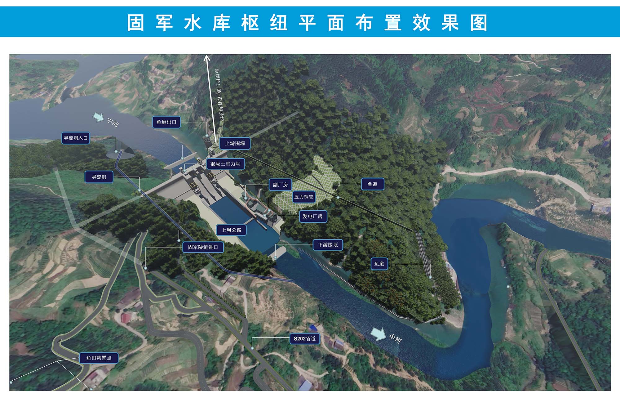 固軍水庫的工程任務以防洪為主,兼顧發(fā)電。固軍水庫為Ⅱ等大(2)型工程,庫總庫容為1.27億立方米,防洪庫容為0.89億立方米,調(diào)節(jié)庫容為0.88億立方米,電站裝機容量為11.6兆瓦,多年平均發(fā)電量為3417萬千瓦時。工程施工總工期為44個月,工程靜態(tài)總投資為293824萬元。